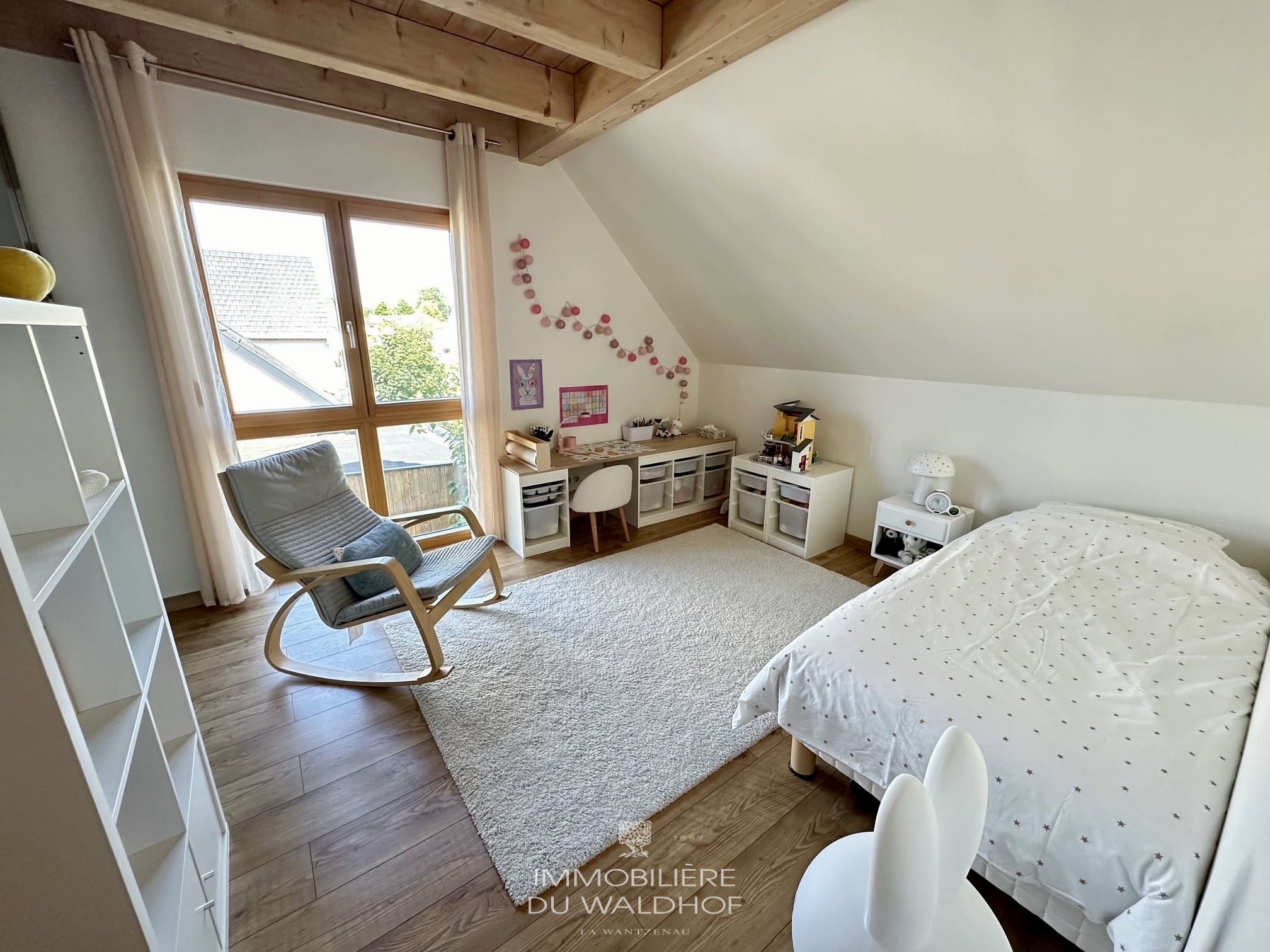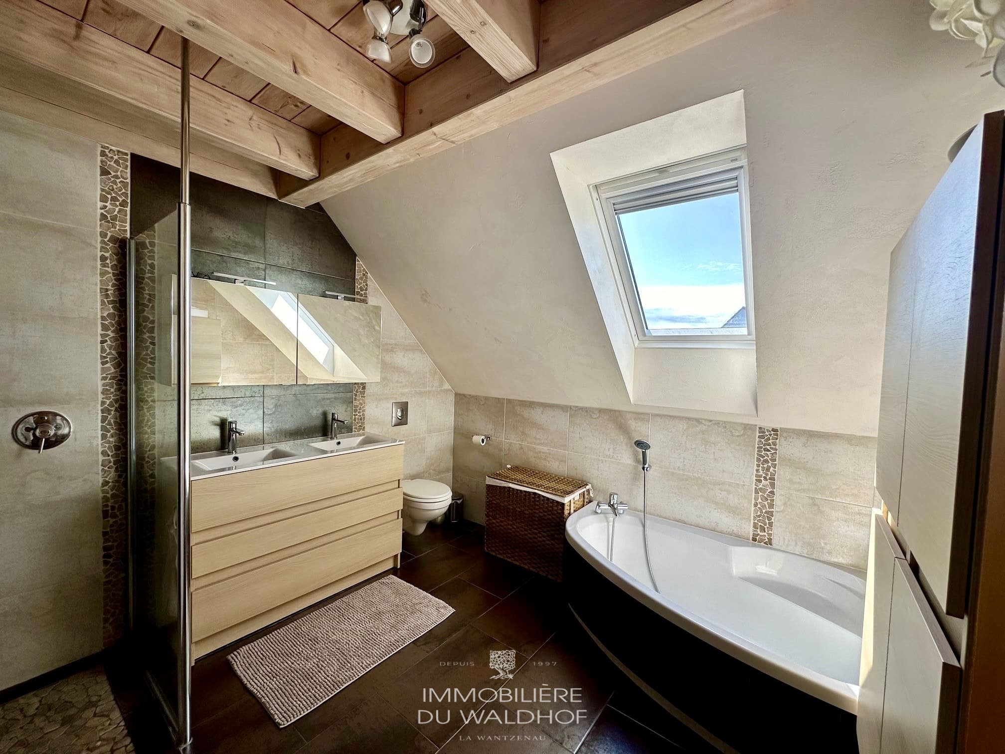 A l’étage : un dégagement, une chambre climatisée avec un dressing privatif, 2 chambres enfant, une grande salle de bain avec douche à l’italienne, baignoire et WC.